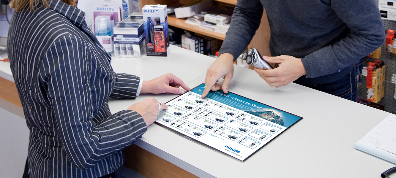 Die Kassenmatte kann auf Theken in Geschäften, Showrooms, Hotels, Kiosken usw. eingesetzt werden, um aktuelle Angebote, Aktionen, neue Produkte oder Dienstleistungen sowie Preislisten, Kundenkarten und vieles mehr zu präsentieren. Ausserdem erfordert die rutschfeste Unterseite keinen Kleber und haftet gut auf der Oberfläche der Theke.